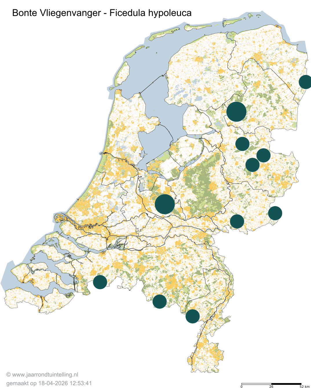 Op de kaart zie je per 5x5 km2 waar de soort is waargenomen in 2026.