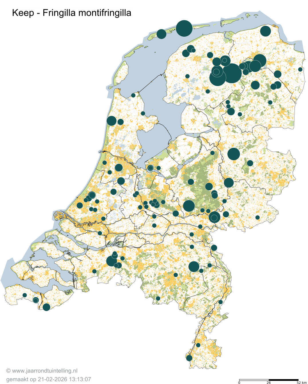 Op de kaart zie je per 5x5 km2 waar de soort is waargenomen in 2026.